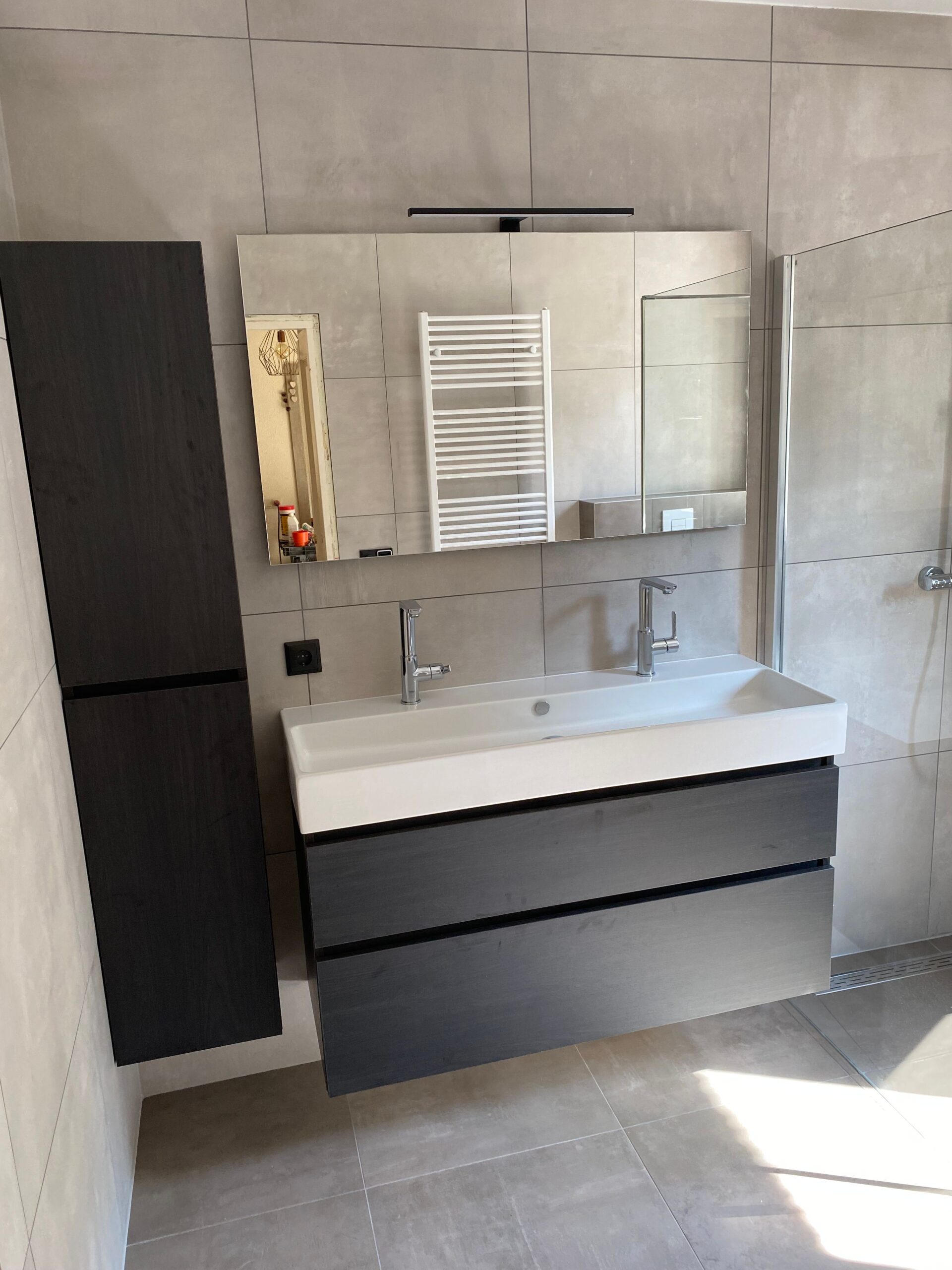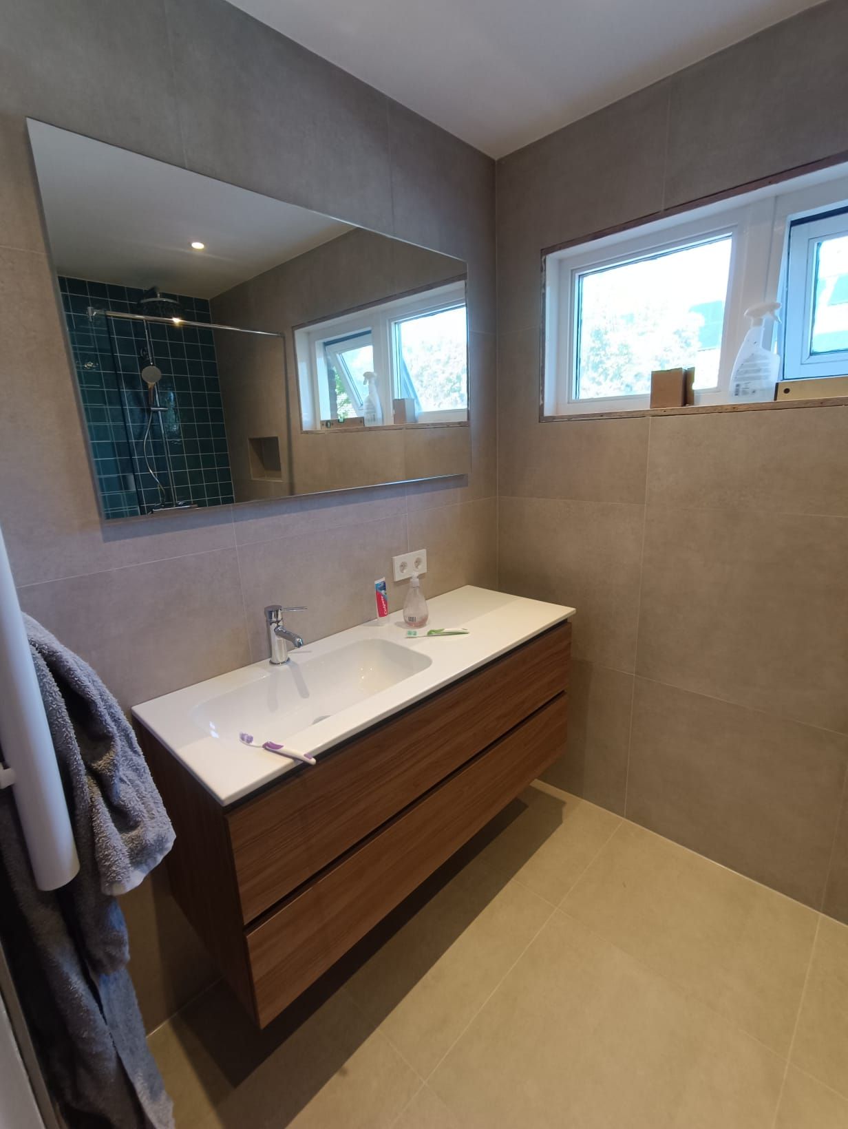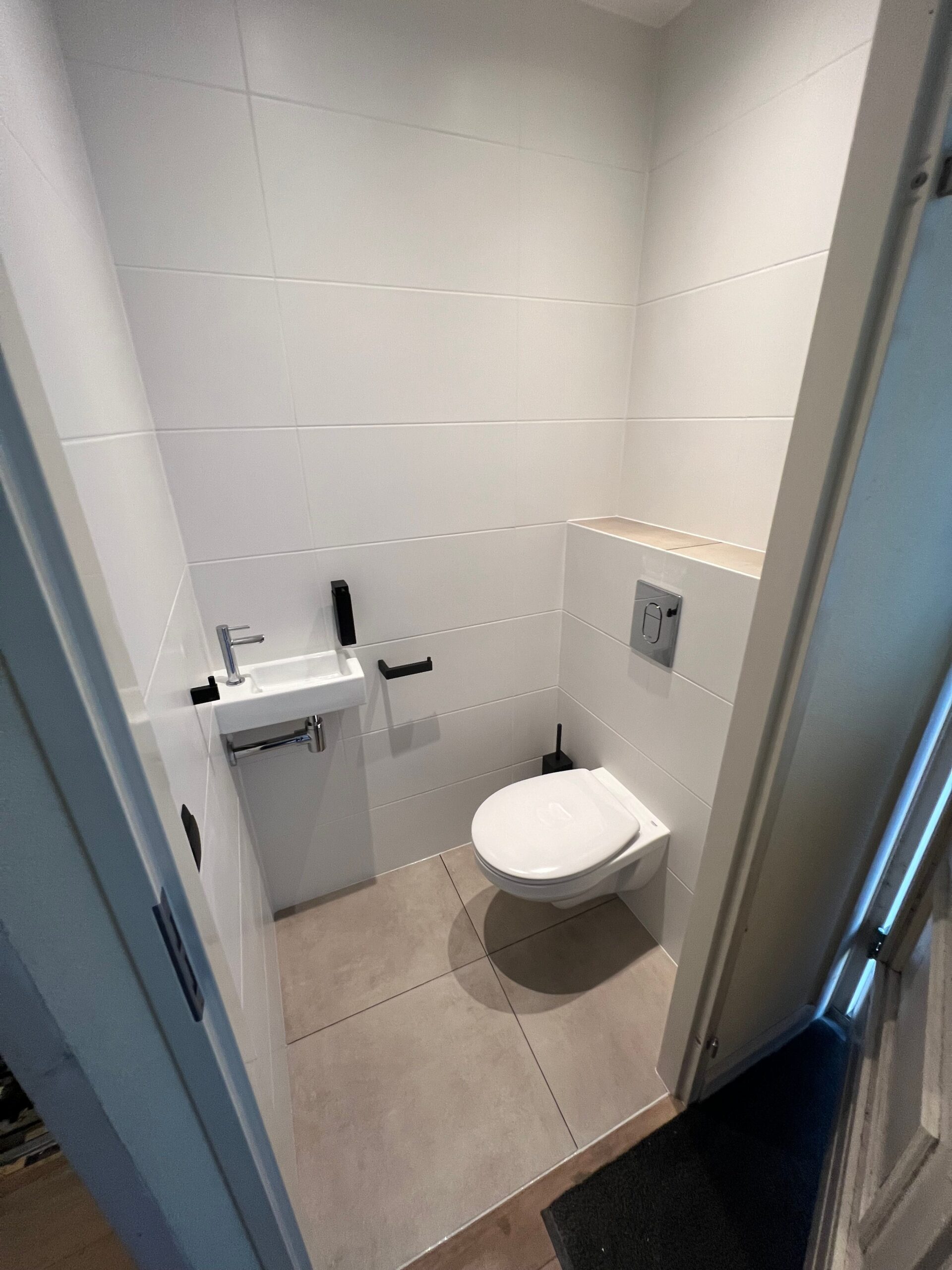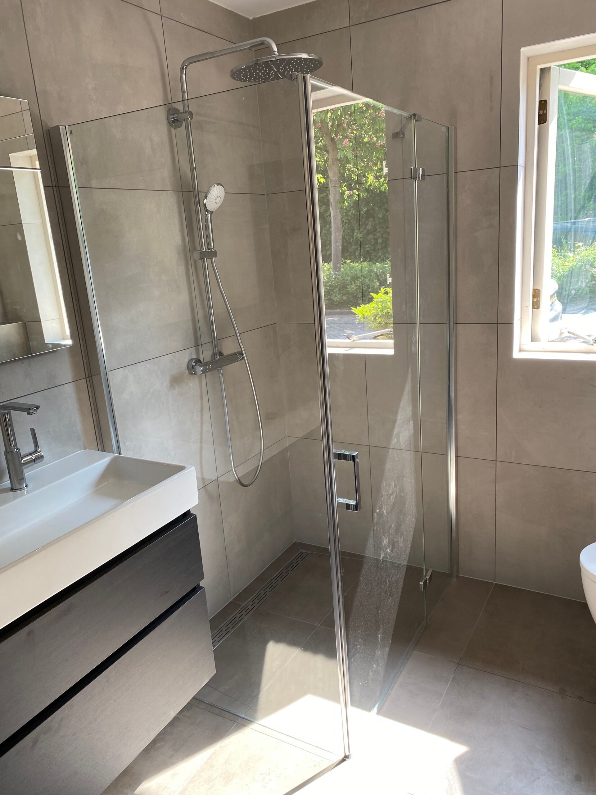 De opdracht was de oude badkamer compleet verwijderen, inclusief de vloer waar onder de beton cire 3 lagen tegels bleken te zitten. Vervolgens het weer opnieuw opbouwen van de badkamer.